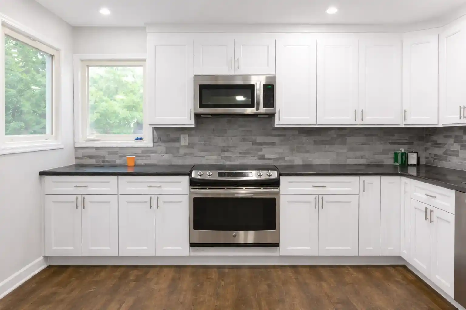 Modern kitchen remodeling in Neptune City, NJ showcasing a stainless steel gas range, built-in microwave, white cabinetry, and textured stone backsplash.